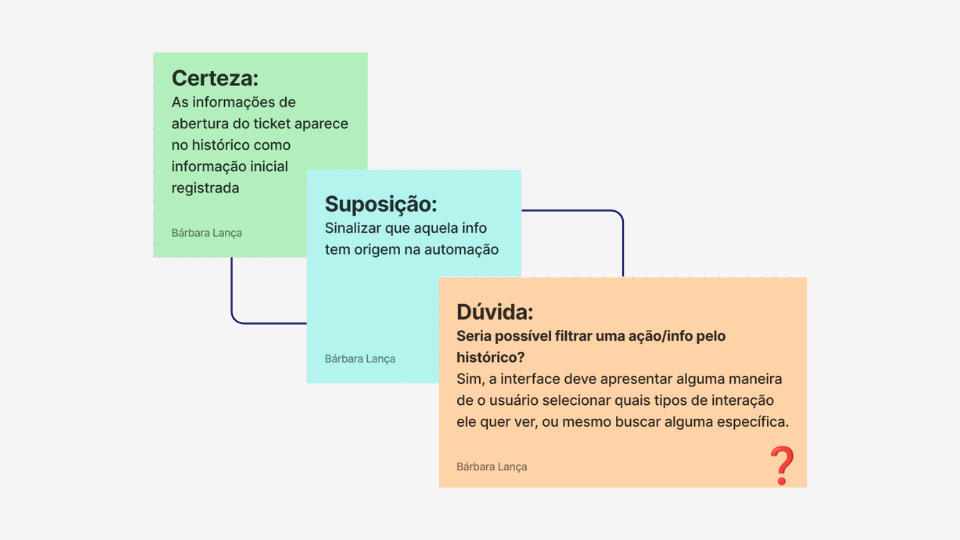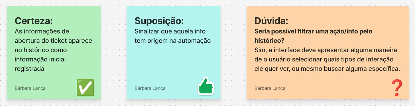 Nesse momento consigo imaginar o famoso estereótipo de que Product Designers são “flanelinha de post-its” (risos). Mas a verdade é que podendo nos identificar através deles, nos permite saber quem adicionou cada nota e, entendendo o contexto de cada contribuição, conseguimos direcionar o esclarecimento de dúvidas com mais assertividade e otimizando o tempo de passagem de conhecimento.